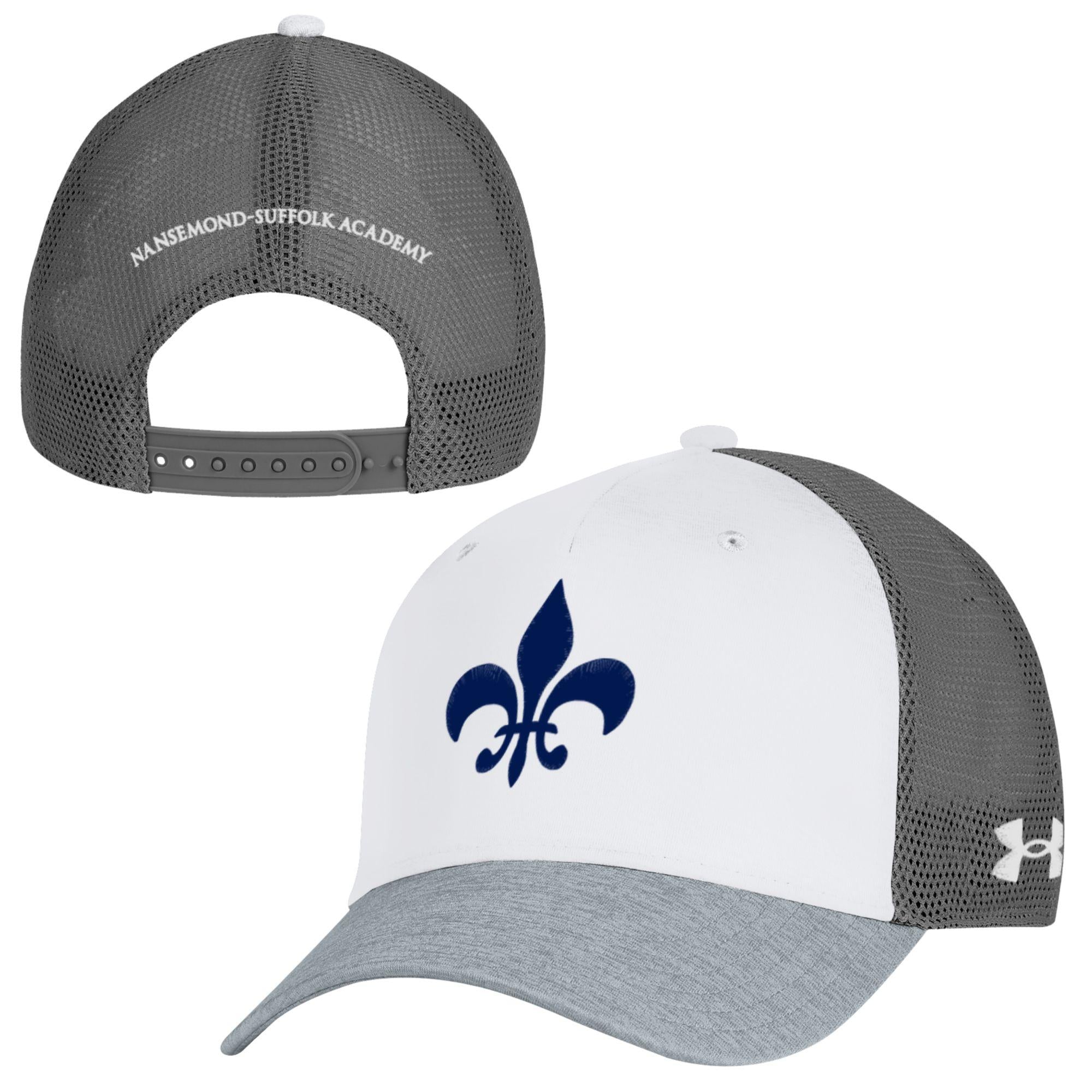 Under Armour unisex twist armour 3.0 trucker snapback hat in white and gray with raised navy fleur de lis embroidery